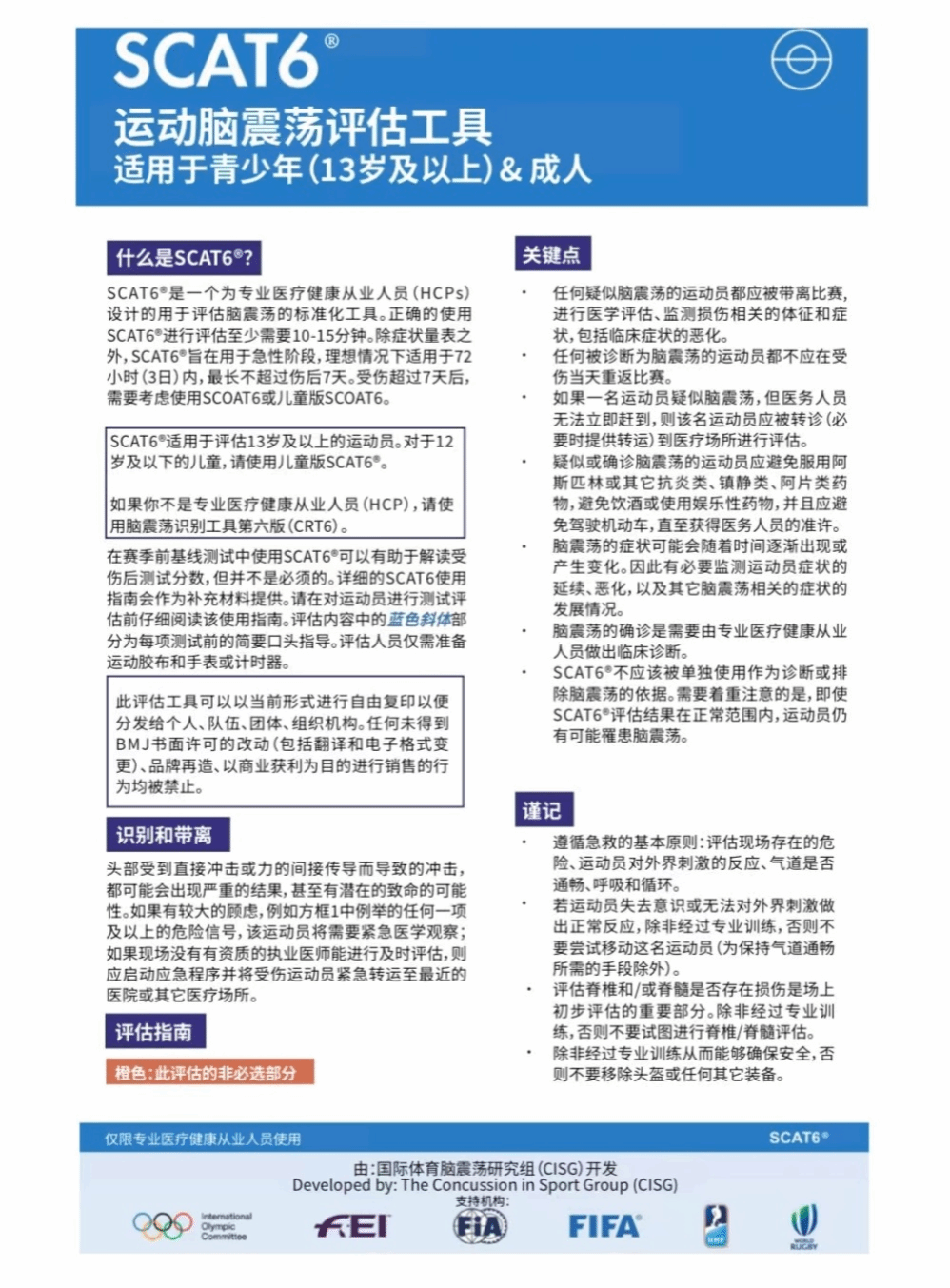国际体育脑震荡研究组(CISG)于2002年开始开发SCAT系列工具,SCAT6是国际足联、国际奥委会、世界橄榄球联会主要认可和使用的临场脑震荡评估工具, 专为专业医疗健康从业者(HCPs)设计使用,以提供运动脑震荡的多模式标准化评估。