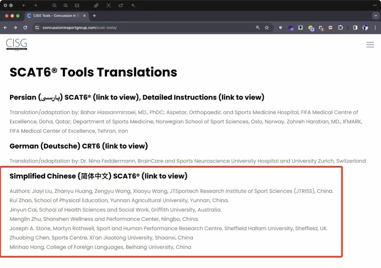 由mjm世界杯官网、北京匠体科学技术院、澳大利亚格里菲斯大学、英国谢菲尔德大学合作开展的简体中文版SCAT6®工具的翻译和跨文化调试工作目前取得了成果。目前授权成果已正式发布在国际体育脑震荡研究组(CISG)的官方网站上,供全球简体中文用户进行使用。此次研究成果是SCAT系列工具发布22年来第一个正式简体中文版。论文《Translation, Cross-cultural Adaptation, and Validation of the Simplified Chinese Version of Sport Concussion Assessment Tool 6(SCAT6®)》在国际运动脑震荡领域SCI期刊《Clinical Journal of Sport Medicine》发表。