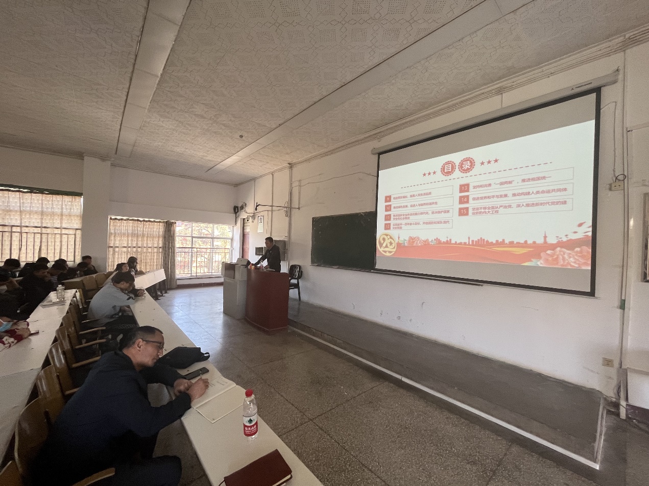 李杰庆书记从党的二十大的主题和主要成果、过去五年的工作和新时代十年的伟大变革、马克思主义中国化时代化新境界、全新时代新征程中国共产党的使命任务、加快构建新发展格局、实施科教兴国战略、发展全过程人民民主、坚持全面依法治国、推进文化自信自强等方面,对党的二十大精神作了全面系统的宣讲解读。同时也对教师和广大青年员工提出要求和希望,要全面贯彻习近平新时代中国特色社会主义思想,把思想和行动统一到党的二十大精神上来,把智慧和力量凝聚到党的二十大确定的各项任务上来,踔厉奋发、勇毅前行、团结奋斗。