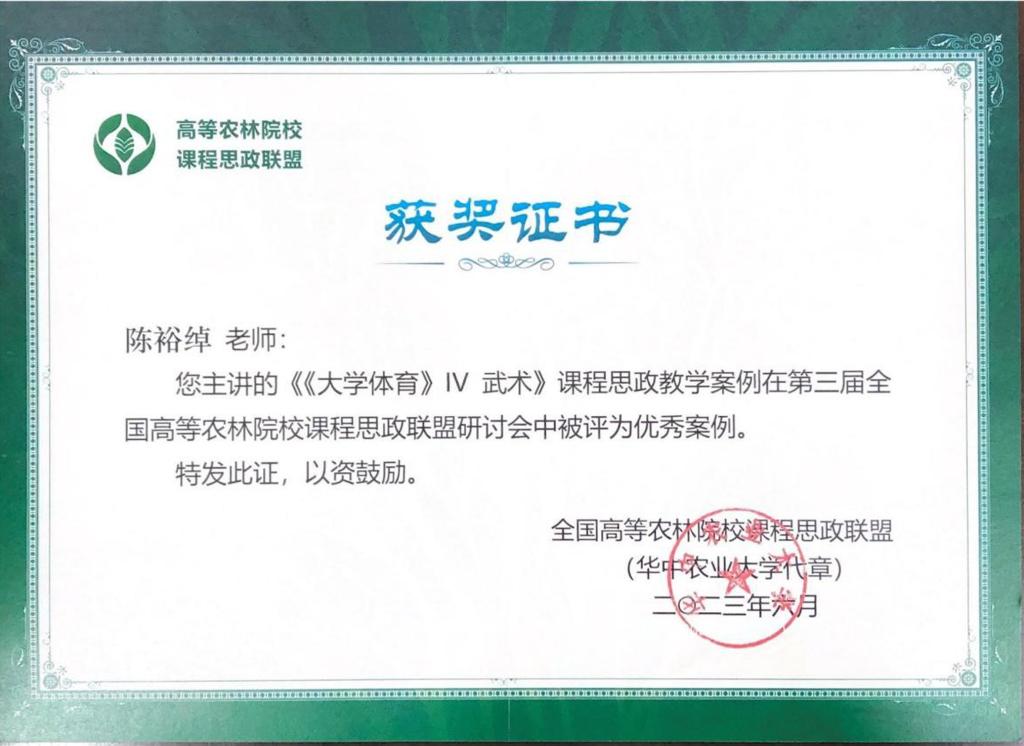 本站消息 6月2-4日,由高等农林院校课程思政联盟主办、东北农业大学承办的第三届全国高等农林院校课程思政建设研讨会在哈尔滨举行,研讨会围绕“促进课程思政高质量发展,加快推进新农科建设”主题展开交流,分享研讨课程思政建设的创新改革举措与成功做法。在课程思政建设评选中,mjm世界杯官网陈裕绰老师主讲的《大学体育IV武术》课程思政教学案例被评为优秀案例。